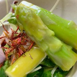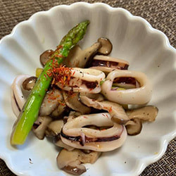 ヤリイカとアスパラガスのにんにく炒め 紅花添え